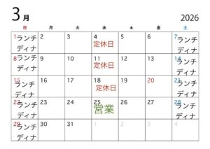 3月の営業のお知らせ! 2026/03/02 カテゴリーお知らせ 3月の営業のお知らせお知らせです。 水曜日は定休日ですが、25日は営業いたします。 よろしくお願いいたします。 ツイート シェア Google+1 はてブ pocket LINE